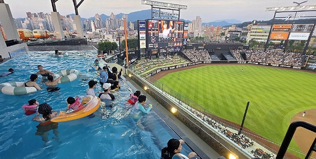 수영하며 야구를 관람할 수 있다니, 신기한 조합인데요. 국내 야구장 내에 수영장이 생긴 것은 이번이 처음이에요. 해외에서도 흔한 사례는 아닌데요. 메이저리그(MLB) 애리조나 다이아몬드백스의 홈구장 체이스필드 외야에 수영장이 있고, 일본프로야구(NPB) 니혼햄 파이터스 홈구장 에스콘필드엔 실내 온천이 있죠. 한화 볼파크처럼 수영장과 경기장의 경계가 보이지 않는 이른바 ‘인피니티풀’ 형식은 세계 최초라고! 😲