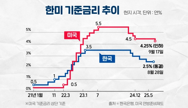 미국 연방준비제도는 지난 17일 연방공개시장위원회(FOMC)를 열어 기준금리를 4.25~4.50%에서 4.00~4.25%로 0.25%포인트 📉내렸어요. 트럼프 대통령이 줄곧 금리 인하를 요구했지만 연준은 노동시장이 안정적이라며 버텨왔는데요. 7월부터 고용 지표가 급격히 악화되면서 방향을 틀었어요.