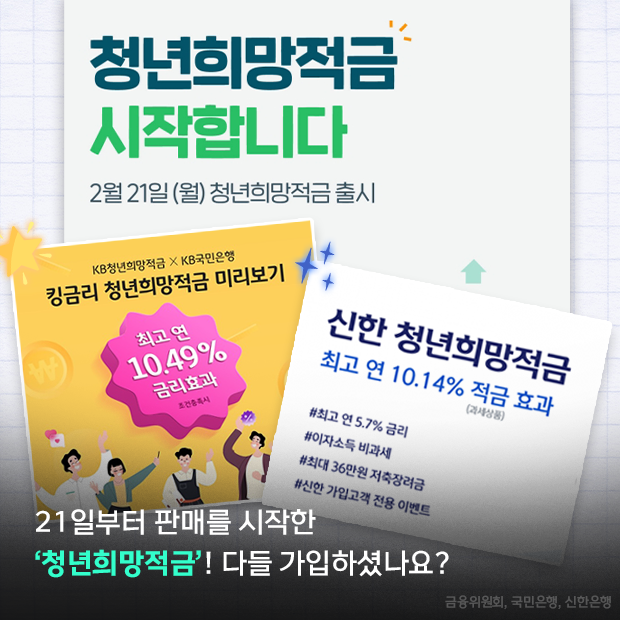 2022.02.23 share 카카오톡 라인 페이스북 트위터 복사 스크랩 좋아요21 청년 가입 못하는 청년희망적금 #목돈 #사회초년생 #재테크 #청년희망적금 Prev 친환경 캠페인 실천하는 기업.zip Next ‘혼행’하기 좋은 곳 어디지? 목록 주간 인기 카드뉴스 ‘혼행’하기 좋은 곳 어디지? 보러가기 최근 혼자 하는 여행 ‘혼행’이 트렌드로 자리잡고 있다고 하는데? 2022.02.22