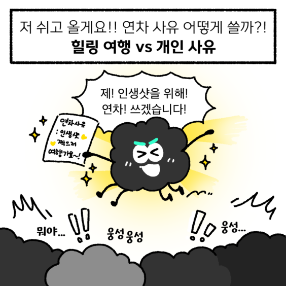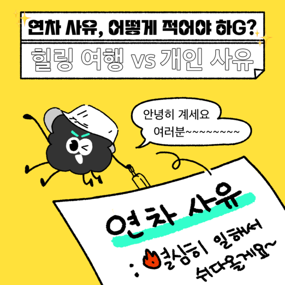 2022.07.25 share 카카오톡 라인 페이스북 트위터 복사 좋아요3 연차 사유, 어떻게 적G? 힐링 여행 vs 개인 사유 연차 사유, 어떻게 적G? 힐링 여행 vs 개인 사유 그래! 결심했어!💪잃어버린 인생샷을 되찾기 위해연차를 쓰기로 한 그런지! 사유를 뭐라고 쓸지 고민 중인데…! 최근 비슷한 이슈가 인터넷을 뜨겁게 달궜죠🔥 이보다 더 구체적일 수가?! 힐링 여행으로 쓰자!vs 아니?! 그냥 개인 사유로 쓰자 사원님의 생각은?! 19 힐링 여행 156 개인 사유 지금 8개의 톡크가 진행중이야 Reset 등록 복숭아색소 174 주 전 0 더보기 답글 신고 걍 개인사유라고 쓰고 나중에 궁금한 사람들한테 뭐 했는지 얘기해줄거임 댓글 0 등록 취소 송파사무실 175 주 전 0 더보기 답글 신고 사유는 그냥 평범하게 하는게 나을듯 댓글 0 등록 취소 chuchu4867 175 주 전 0 더보기 답글 신고 눈치보여서...개인사유!! 댓글 0 등록 취소 MMM_MMMING 176 주 전 0 더보기 답글 신고 휴가에 사유가 필요한가요? 내 휴가 내가 쓰는데!!! 댓글 0 등록 취소 과장_팔독자입니다:) 176 주 전 0 더보기 답글 신고 당당히 여행 간다고 씁니다 내가 간다는데 어쩔건데? 댓글 0 등록 취소 폭주요정 176 주 전 0 더보기 답글 신고 힐링 여행은 뭔가 TMI느낌.. 당일연차 쓰는게 아니라면 내가 왜 연차를 쓰는지 굳이 디테일하게 알려주고 싶지 않음. 댓글 0 등록 취소 moni 176 주 전 0 더보기 답글 신고 심신의 안정과 두뇌 리플래시를 위한 휴가사용에 당당해야죠 댓글 0 등록 취소 그린웨어 176 주 전 0 더보기 답글 신고 사실 여행간다고 쓰는게 조금 사적이어보일뿐 나쁜건 아닌데... 휴식 = 불성실으로 보는 기업문화가 언젠가 바뀌었으면 좋겠습니다 댓글 0 등록 취소 더보기 목록