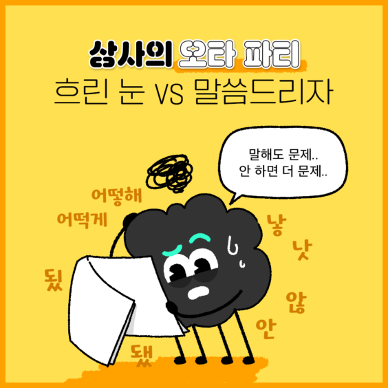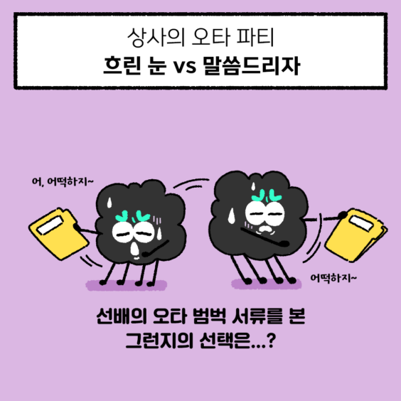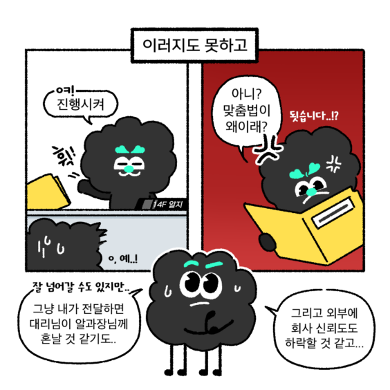 2022.10.05 share 카카오톡 라인 페이스북 트위터 복사 좋아요1 상사 서류에서 오타 발견 흐린 눈 vs 말하자 상사 서류에서 오타 발견 흐린 눈 vs 말하자 착한지 대리의 서류를 전달하는 그런지예상치 못한 당황스러움을 마주하는데...선배님 서류에 내가 맞춤법 지적이라... (않이 외않되?) 사원님들은 어떻게 생각하시나요? 84 흐린 눈 207 말하자 지금 7개의 톡크가 진행중이야 Reset 등록 요를리히 163 주 전 0 더보기 답글 신고 일반 톡이면 몰라도 서류면 얘기해 줘야지 댓글 0 등록 취소 야광도깨비 165 주 전 0 더보기 답글 신고 뭘 망설여 말해줘야지ㅋㅋ 엇 여기 오타났어요 댓글 0 등록 취소 leciel 165 주 전 0 더보기 답글 신고 말씀드리고 대안을 제시해 드린다. 댓글 0 등록 취소 윤슬달 166 주 전 0 더보기 답글 신고 한글 맞춤법 검사기 추천해 드리고 생명의 은인인 척 하극상 🫠 댓글 0 등록 취소 꼬꼬는뚠뚠 166 주 전 0 더보기 답글 신고 밑에 두 댓글도 띄어쓰기 다 틀림ㅋㅋㅋ 댓글 0 등록 취소 과장_팔독자입니다:) 166 주 전 0 더보기 답글 신고 대리한테 고치라고 말하면 대리 자존심 상해서 화 낼 가능성 90% 댓글 0 등록 취소 지지얌 166 주 전 0 더보기 답글 신고 그래도 잘못된 게 있는데 말해야죠. 말 안하고 있다가 이것도 못봤어 하고 꾸지람 들을 듯 댓글 0 등록 취소 더보기 목록